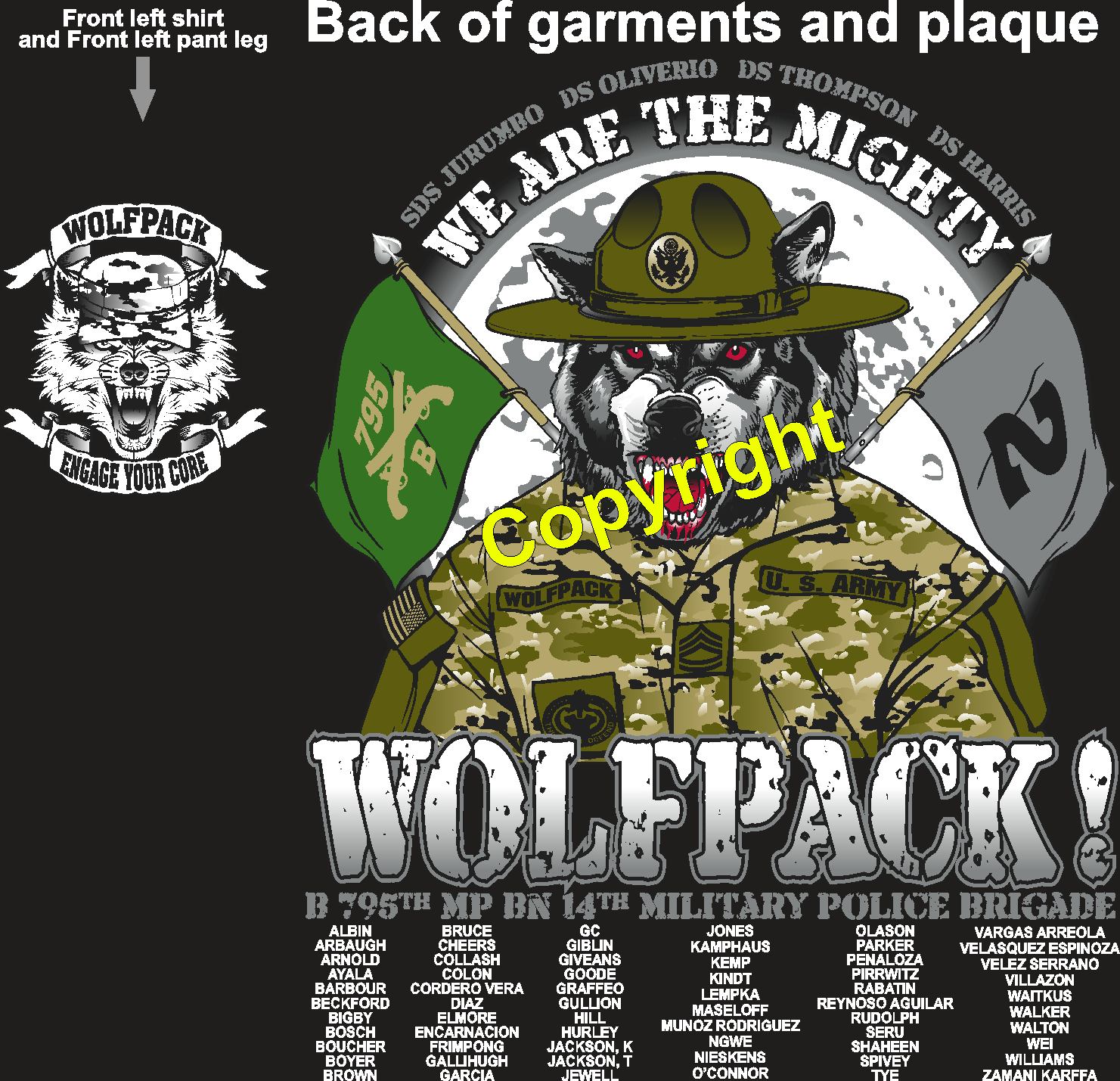- The sweat pants will have the same design as the front of the t-shirt with the platoon name running down the front left thigh.